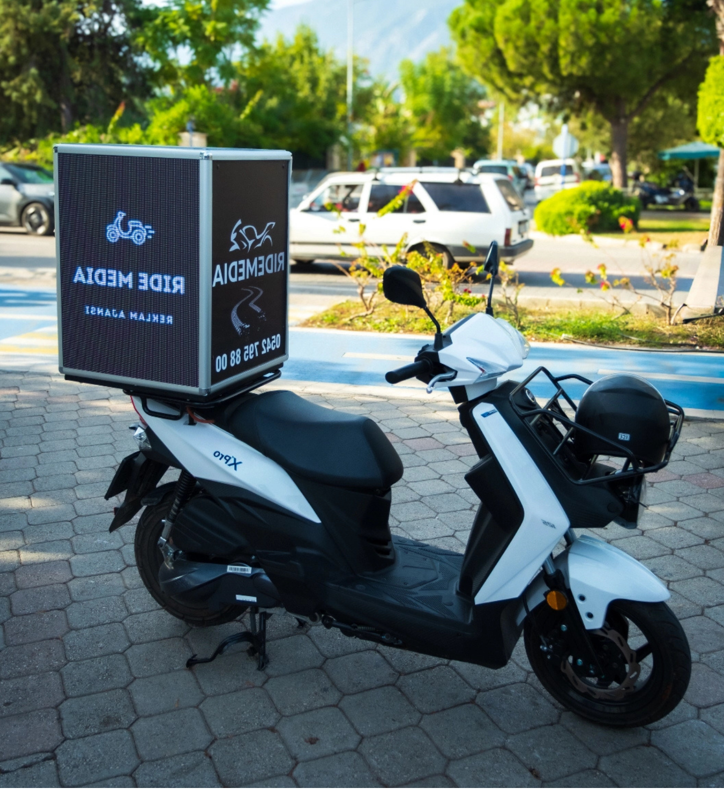 Merhaba! Ride Media olarak, motorlara entegre LED ekranlarla sunduğumuz mobil reklam çözümleri hakkında tüm sorularınız, fiyat talepleriniz veya kampanya planlamaları için bizimle iletişime geçebilirsiniz. Size en hızlı, en profesyonel ve en güvenilir şekilde yardımcı olmaktan memnuniyet duyarız.